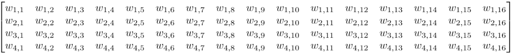 假设我们有一个4×4的输入,目标是把它转换成2×2的输出。这时,如果我们用的是前馈网络,我们会把这个4×4的输入重新转换成一个长度为16的向量,然后把这16个值输入一个有4个输出的密集连接层中。下面是这个层的权重矩阵W: