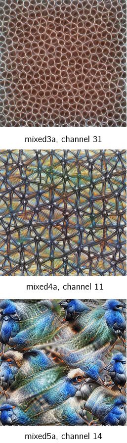 这种感受野的扩大允许卷积层将低级特征(线条、边缘)组合成更高级别的特征(曲线、纹理),正如我们在mixed3a层中看到的那样。而随着我们添加更多Stride层,网络会显示出更多高级特征,如mixed4a、mixed5a。