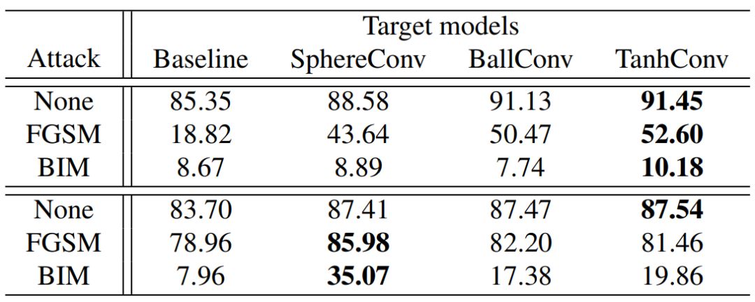 表 7:CIFAR-10 上的白盒(White-box)攻击,性能用准确率(%)度量。前三行是标准训练模型的结果,后三行是对抗训练模型的结果。