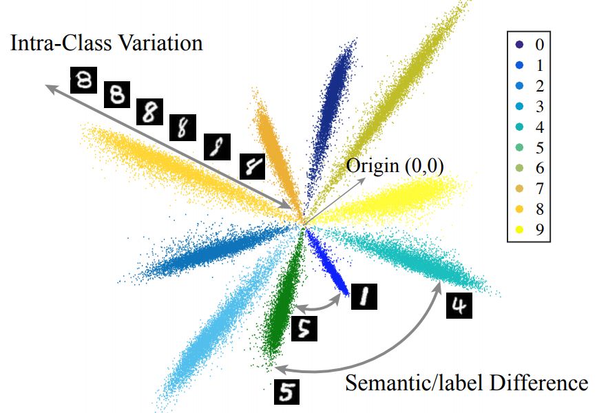 图 1:CNN 学得的特征天然是解耦的。图中的 2D 特征是通过将 CNN 特征维度设置为 2 直接得到的输出。