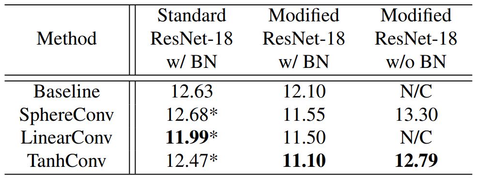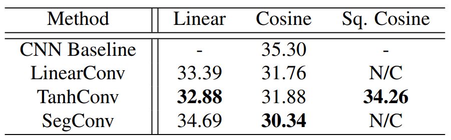 表 2:未使用反向传播的原始 CNN-9 在 CIFAR-100 上的测试误差(%)。「N/C」表示模型未收敛,「-」表示没有结果。不同列中的结果来自于不同的角度激活函数(angular activation)。