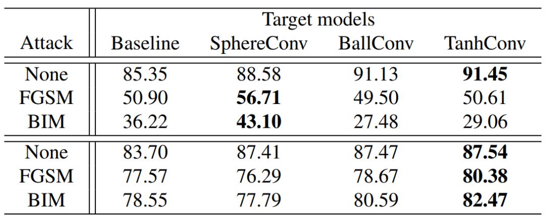 表 8:CIFAR-10 上的黑盒(Black-box)攻击,性能用准确率(%)度量。前三行是标准训练模型的结果,后三行是对抗训练模型的结果。