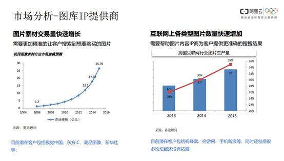 另外就是国内的图库IP公司。我们拿到了04年到16年的一个数据,可以直接看到图片素材的交易量有了快速增长的趋势,国内也有很多这样的客户,包括视觉中国、东方IC…