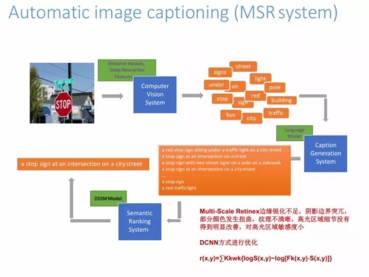说说我们最近做的一些工作,这是一个MSR系统,我们在用DCNN的方法做优化,用image captioning来做这个系统的时候会面临一些问题。在这里用Multi-Scale Retinex技术会存在一些问题,比如边缘锐化不足,阴影边界突兀比较大, 部分颜色发生扭曲等。我们试过了很多方法,也做了很多参数的优化处理,发现效果都不是很好,Hinton出了capsule之后,我们立马开始去对物体坐标性的点进行描述处理,而不用BP的反向处理方式,现在我们正在做一些算法的猜想证明。