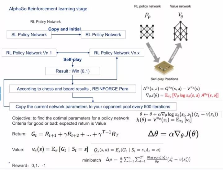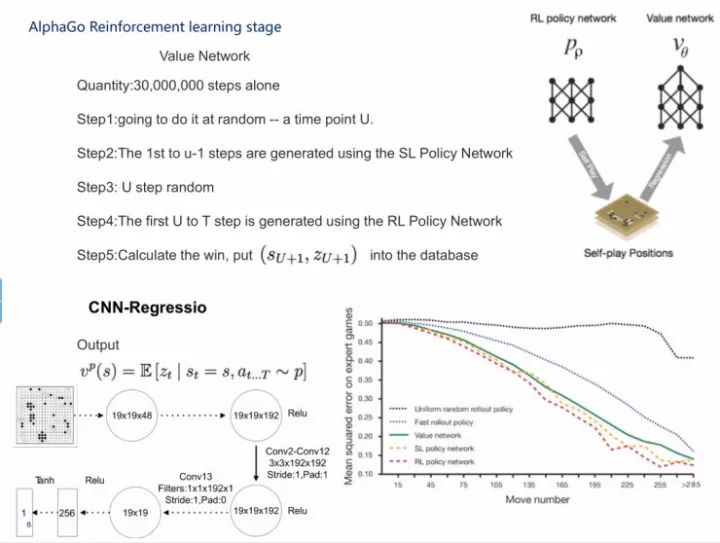 到了做强化学习的时候,它会把原来通过机器学习过来的监督神经网络copy到强化神经网络里,然后进行初始化,让强化神经网络作为对手和另一个强化神经网络进行互相学习,来选择一个最优的结果。具体细节如PPT所示,500次做一次迭代,在这里会用到一些梯度下降的方式。