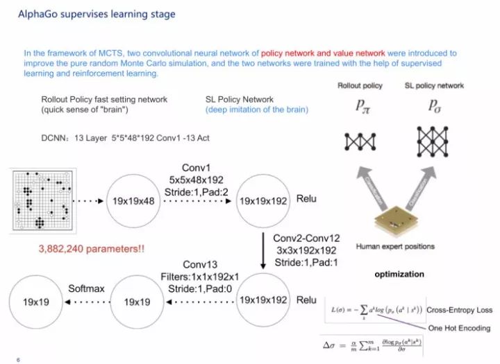 AlphaGo的监督学习过程其实由两个网络组成,一个是从其他人中获得的学习经验,先是做了一个softmax,即快速落子,它的神经网络比较窄,第二部分是深度监督式神经网络。