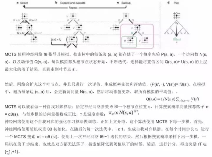 搜索树中的每条边 (s, a) 都存储了一个概率先验 P(s, a)(概率先验是在CNN里非常关键的问题)、一个访问数 N(s, a)以及动作值 Q(s, a)。每次模拟都从根节点状态开始,不断迭代,选择能将置信区间 Q(s, a)+ U(s, a) 的上层最大化的落子结果,直到走到叶节点s′。 然后,网络会扩充这个叶节点,并且再进行一次评估,生成概率先验和评估值。在模拟中,遍历每条边(s, a) 后,会更新访问量N(s, a),然后将动作值更新,取得所有模拟的平均值。
