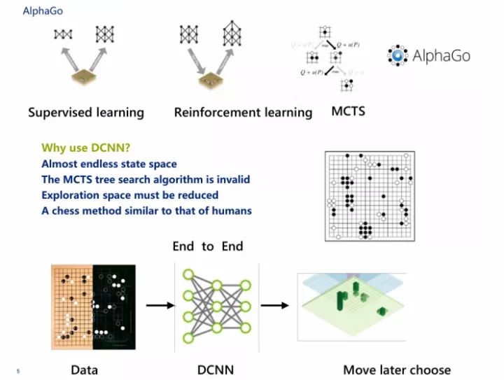 第四个问题,它必须要做一种类似于人类下棋的方法。那么刚才有朋友问到什么是端到端,端到端在AlphaGo里边表现得非常明确。我把数据扔给神经网络,然后神经网络马上给出我一个状态,这个状态有两个,包括目前状态和目前状态的价值,这非常有效,表示棋子落在哪里,以及赢的概率到底有多大。