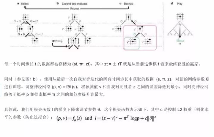 第二步是AlphaGo Zero中神经网络的训练。该神经网络将棋盘位置st作为输入,与参数θ一起将它传送到许多的卷积层,并同时输出表示每一走子的概率分布的向量pt和一个表示当前玩家在位置st上的赢率的标量值vt。同时MCTS 使用神经网络 fθ 指导其模拟。