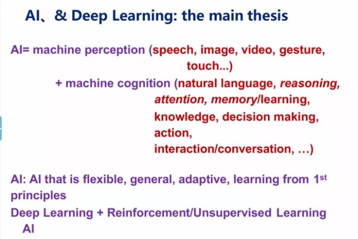 以下为他的分享内容,本文为上篇,包括Hinton引导下的机器学习的发展过程,机器感知和机器认知、深度学习在AI上的应用、深度学习在未来的应用。
