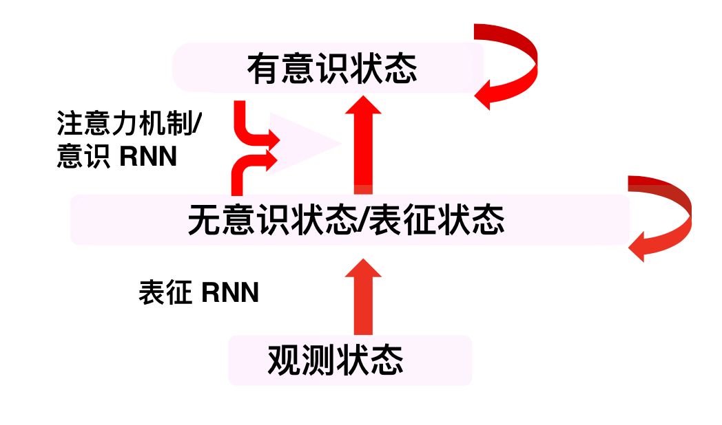 感知状态通过一个表征 RNN 得到无意识状态,无意识状态通过一个注意力机制,或称意识 RNN 得到有意识状态。获得好的表征 RNN,从而得到好的表征,是表征学习的目的。