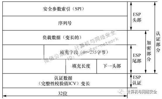 填充:0~255个字节,填充字段的长度与负载数据的长度和算法有关,用来确保所加密的数据块长度达到加密算法所需的字节要求,具体的填充方式要视所采用的加密算法而定。