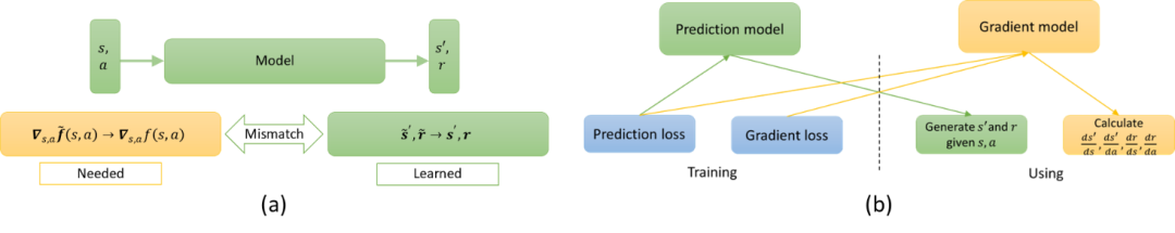 图2: (a)模型学习和使用中的不一致。 (b)DDPPO 算法的示意图。DDPPO 算法分别构造了预测模型和梯度模型。DDPPO 算法使用不同的损失函数去分别训练这两个模型,并且在策略优化中分别恰当地使用他们。