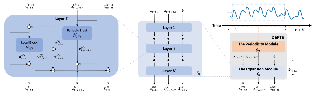 然后,基于一段观测的时间序列信号及其相应的隐式周期状态,展开模块负责捕捉观测信号与隐式周期之间复杂的依赖关系并做出预测。在这里,研究员们拓展了经典的深度残差学习思想开发了一种深度展开学习架构。在这个架构中,研究员们会对输入的时间序列及其隐式周期做逐层的依赖关系展开并得出相应预测分量。在每一层中,由参数化的周期神经网络来决定本层聚焦的周期分量,并展开观测信号的回看和预测分量。在进入下一层前,研究员们会减去本层中产生的周期分量和回看分量,从而鼓励后续的神经网络层聚焦于尚未展开的周期性依赖。按照这样的模式堆叠 N 层就构成了(深度)展开模块。