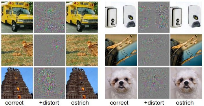 如图所示,每张图像都是用一个噪点图像处理之后的,它在视觉上根本不会改变原始图像,但却被错误分类为鸵鸟!