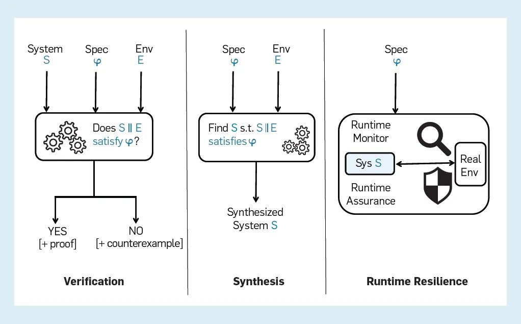 其核心在于,形式方法是关于证明的:制定形成证明义务的规范,设计系统以履行这些义务,并通过算法证明搜索来验证系统确实符合其规范。从规范驱动的测试和仿真到模型检查和定理证明,一系列的形式化方法常被用于集成电路的计算机辅助设计,并已广泛被用于发现软件中的错误,分析网络物理系统,并发现安全漏洞。