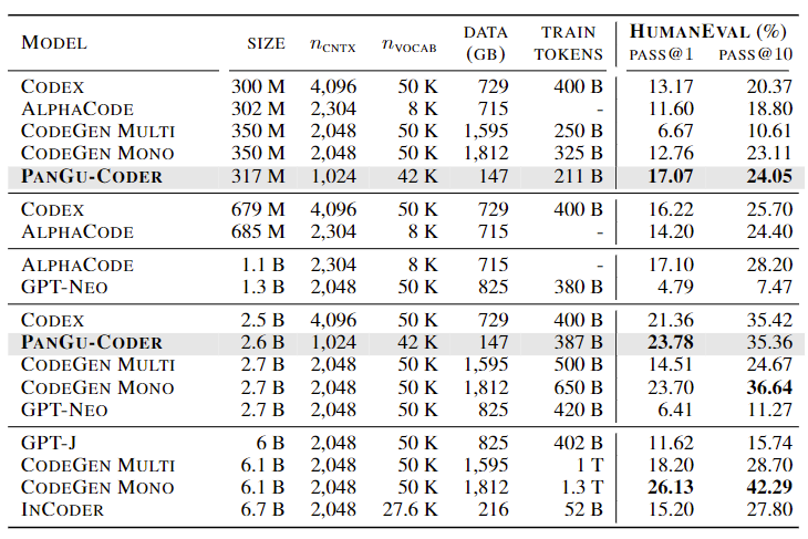 事实证明,这个想法是正确的。模型的一次生成通过率(PASS@1)是代码语言生成模型最重要的能力衡量指标,从这个数据上来看,采取数据集构建策略和分阶段训练设计的 HUAWEI PanGu-Coder 在 3 亿级别上的准确率相比其它公开模型要高很多:3 亿参数的 HUAWEI PanGu-Coder 模型(PASS@1=17.07%)超越了 Codex(PASS@1=16.22%)接近 7 亿参数的模型结果,基本持平了谷歌 10 亿的模型。