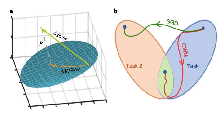 图1:OWM算法原理示意图。(a): 在权重更新时,OWM算法只保留传统BP算法计算的权重增量中与历史任务输入空间正交的部分。(b): 在新任务中,OWM算法将神经网络对解的搜索范围约束在旧任务的解空间中。
