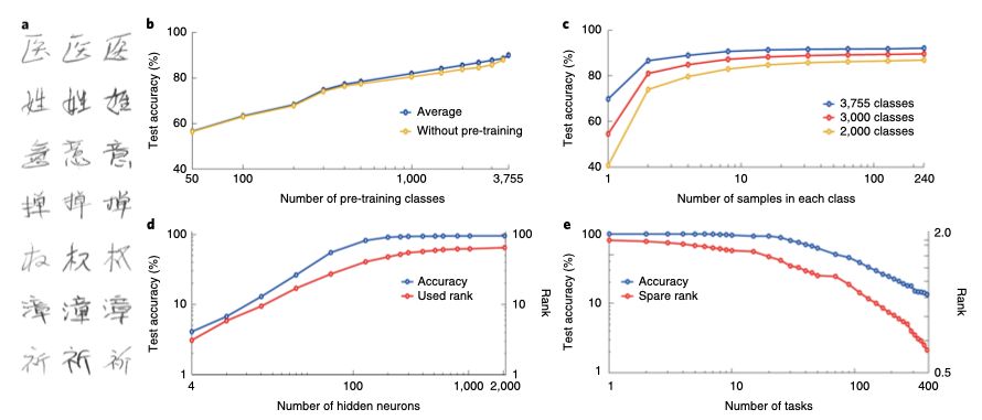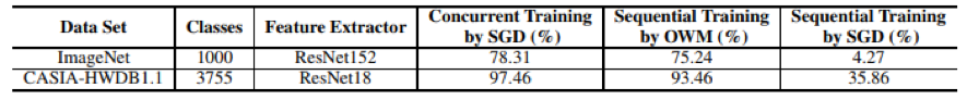 图3:OWM算法在ImageNet和中文手写体汉字识别的连续学习任务上体现出优良的性能