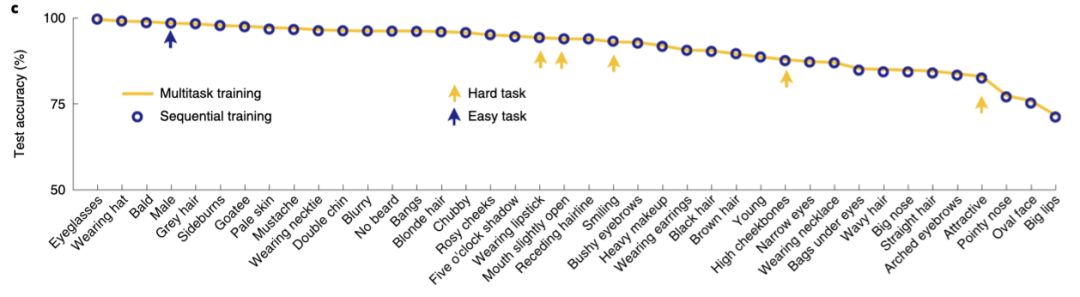 图6:同一个分类器对于同样的输入,连续学习40种不同人脸属性的分类任务(蓝色数据点),正确率与用40个分类器的系统(橙色线)几乎一致。