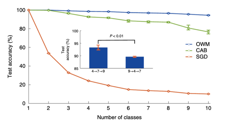 图2:在连续学习MNIST手写体数字0-9的任务中,随着任务数目的增加,OWM算法的优势也愈加明显。同时,任务的学习顺序会对个别任务产生影响。如先学数字4和7,会显著提升数字9的识别正确率。