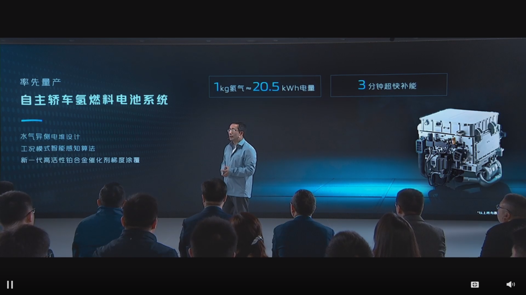 另一边的氢燃料电池版,补充氢气只需要 3 分钟时间,单次补能 CLTC 续航里程超过 700km,氢消耗被控制在 0.65kg/100km 以内。