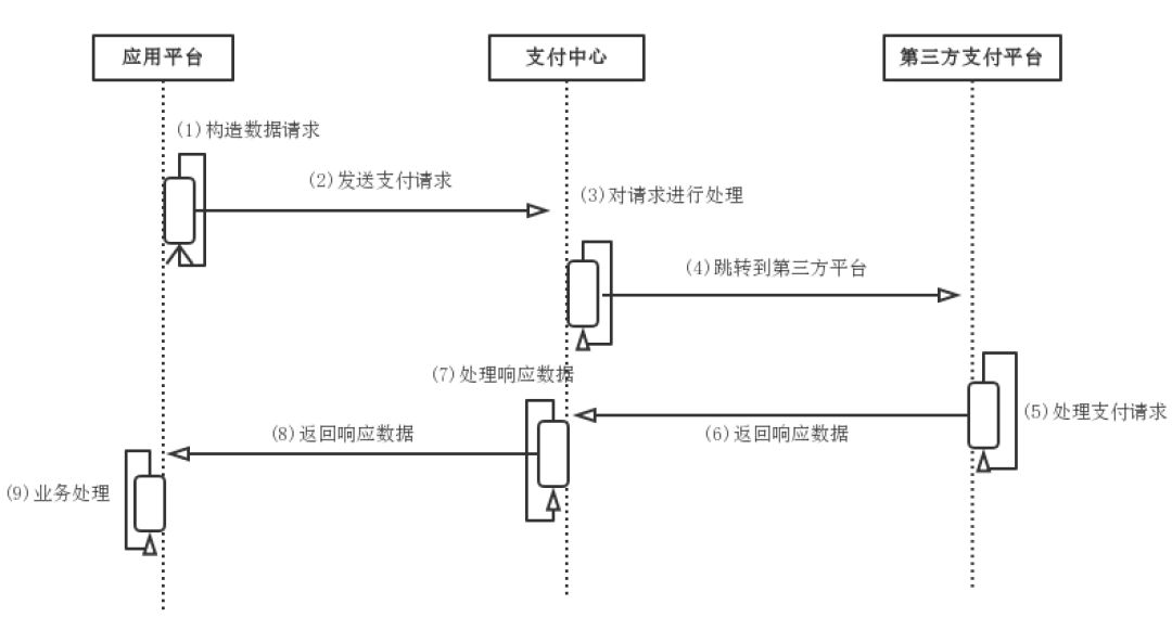 初期为快速响应业务的支付、退款以及一些基础需求,支付中心主要负责接入支付通道(支付宝、微信、连连等),由各业务线分别实现收银台,然后调用支付中心进行支付。业务系统、支付中心和第三方通道的交互流程图如下: