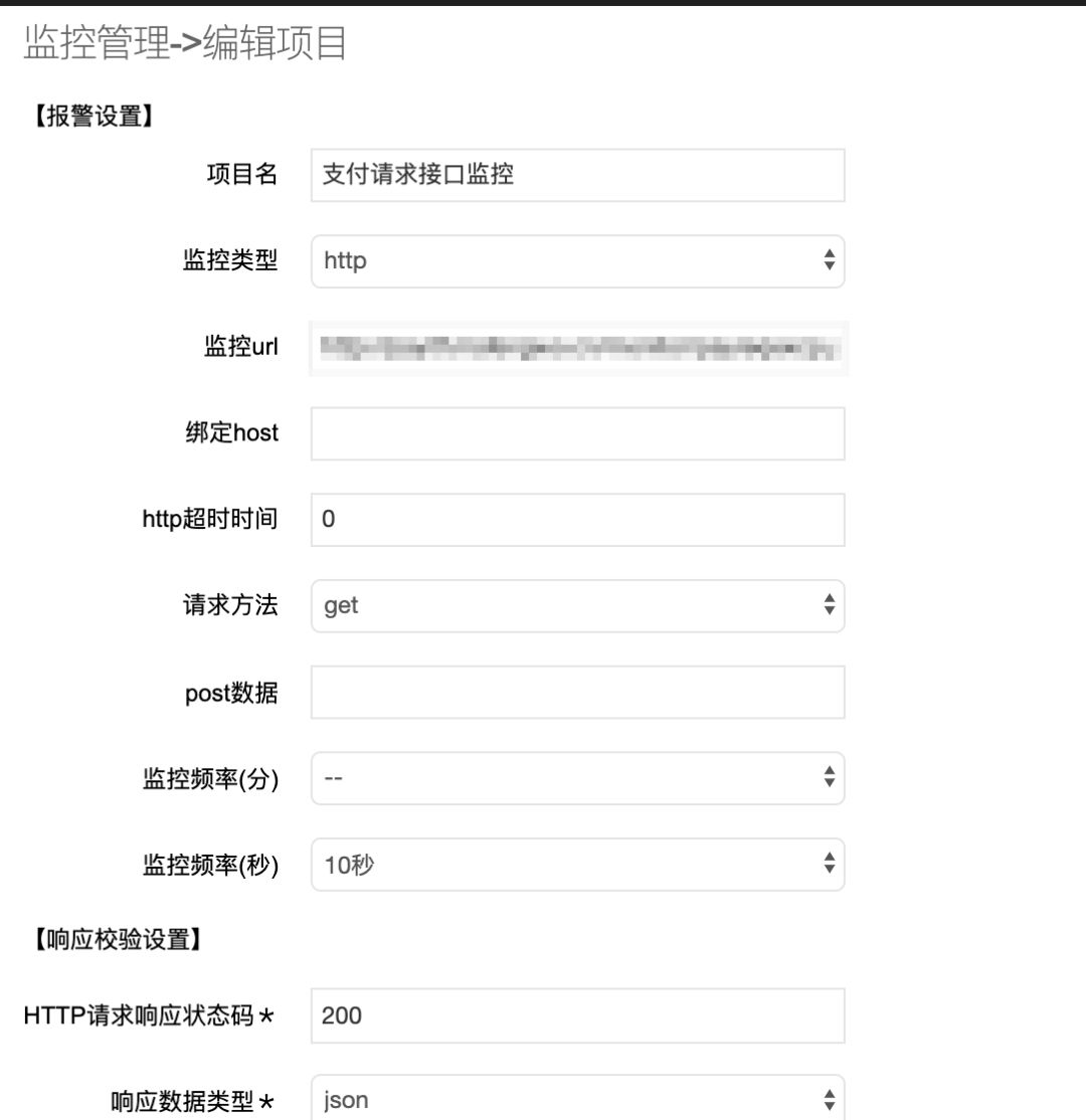 接口监控可以针对固定 host IP 绑定以及设置超时时间,监控请求支持 GET、POST 两种方式,POST 方式可以设置固定请求参数辅助,监控频率支持分钟、秒两种级别配置;响应数据模块可以校验 HTTP code 是否异常,配置响应数据类型,比较检测返回 key 值,针对 DB 监控还可以设置 DB 查询超时时间;报警模块目前支持短信和邮件两种方式,可以设置最小、最大报警阈值,超过最大阈值每隔最大报警数会触发一次报警,规避了故障期间短信轰炸问题。