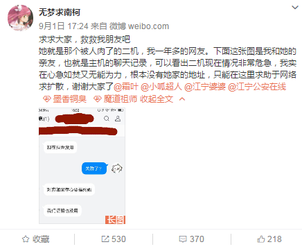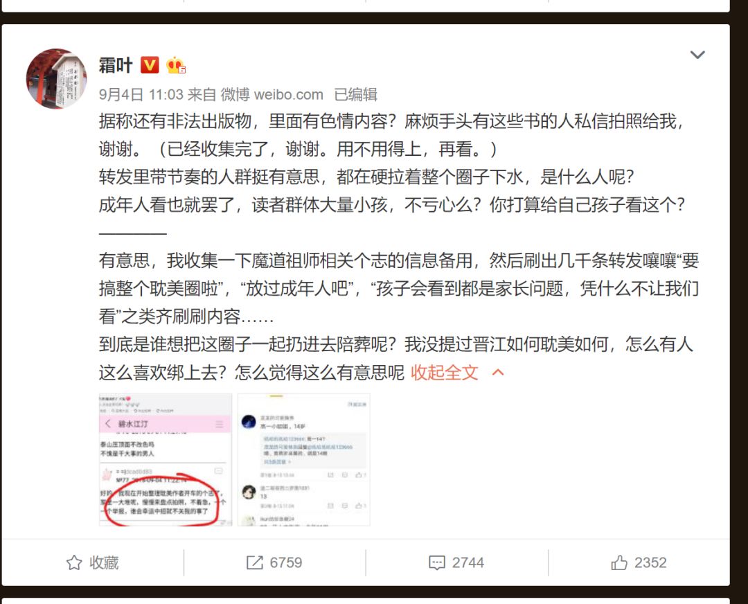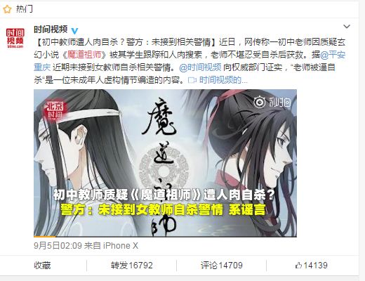 起因:9月1日,一条“求救”微博刷了屏,称其网友因遭到恶意人肉骚扰而选择自杀,而原因则是她发表了对网络小说“魔道祖师”的负面评价遭其书粉报复,其收到的相关自身个人信息和疑似被跟踪的骚扰信息随后也被扒了出来。