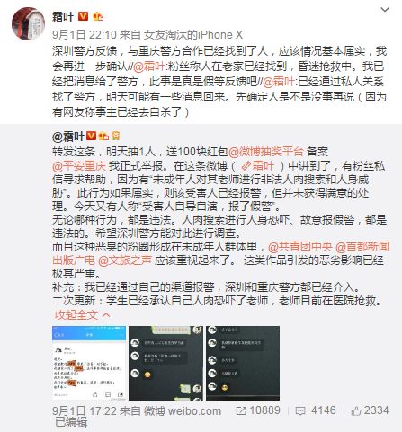 9月5日,多个媒体官微也随即发布了此事属谣言的消息,此前“昏迷抢救”与“警方合作”变得匪夷所思,而霜叶对此回复道“自杀不存在,但人肉搜索的确是存在的”。