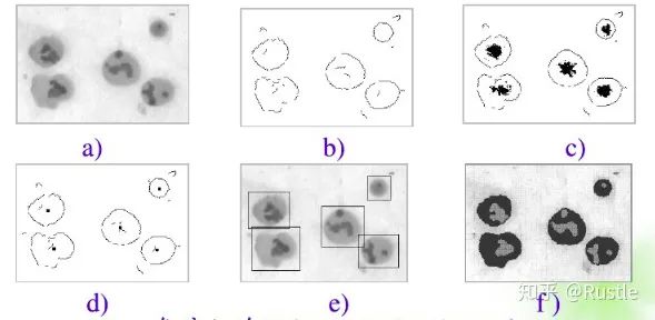 我们可以简单理解为就将一幅原始图像,使用计算机处理为更为我们所能理解或所需要的形式,如图1-1所示,为基于边缘检测的免疫细胞图像自动分割过程示意图