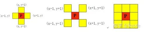 4邻域: 假设有一点像素p坐标为(x, y),则它的4领域是(x + 1, y), (x - 1, y), (x, y + 1), (x, y - 1)