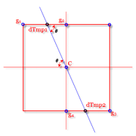 如图 3-6所示,C表示为当前非极大值抑制的点,g1-4为它的8连通邻域点,图中蓝色线段表示上一步计算得到的角度图像C点的值,即梯度方向,第一步先判断C灰度值在8值邻域内是否最大,如是则继续检查图中梯度方向交点dTmp1,dTmp2值是否大于C,如C点大于dTmp1,dTmp2点的灰度值,则认定C点为极大值点,置为1,因此最后生成的图像应为一副二值图像,边缘理想状态下都为单像素边缘