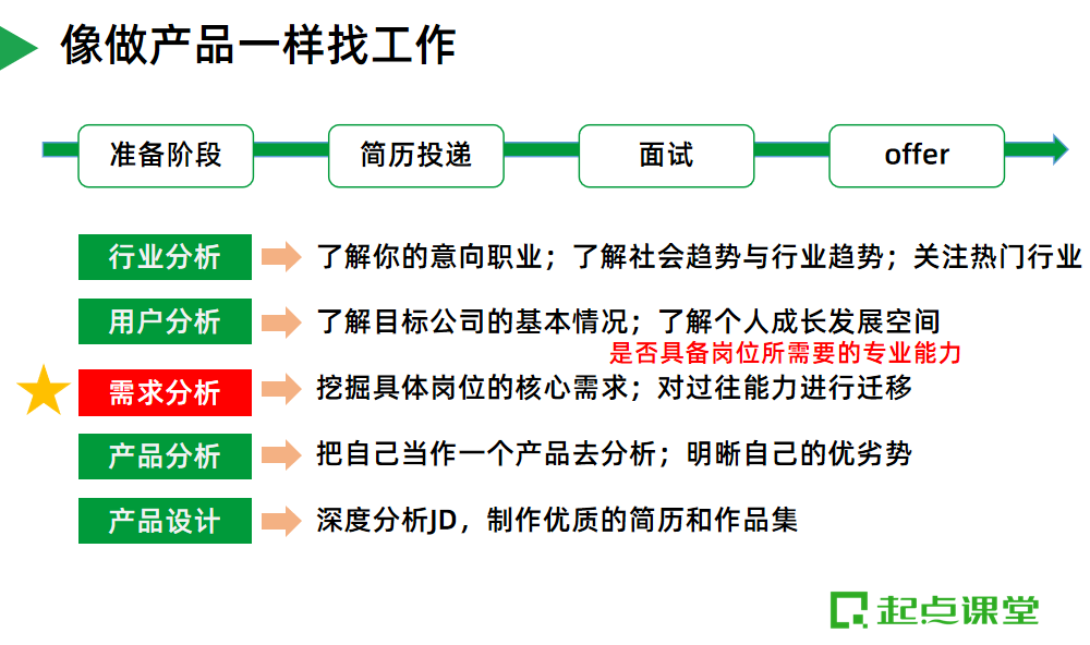 当像做产品一样找工作时,我们就是一个待打磨的产品,而使用者便是面试官,我们通过前期的分析了解市场及目标用户,并把自己优化迭代成为符合目标用户需求即面试官需求的产品,最终拿下offer。