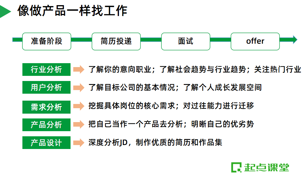 既然我们想成为产品经理,那么不妨可以把找工作拿下转岗offer这件事情当成是在做产品,像做产品一样找工作,看看我们需要做些什么。