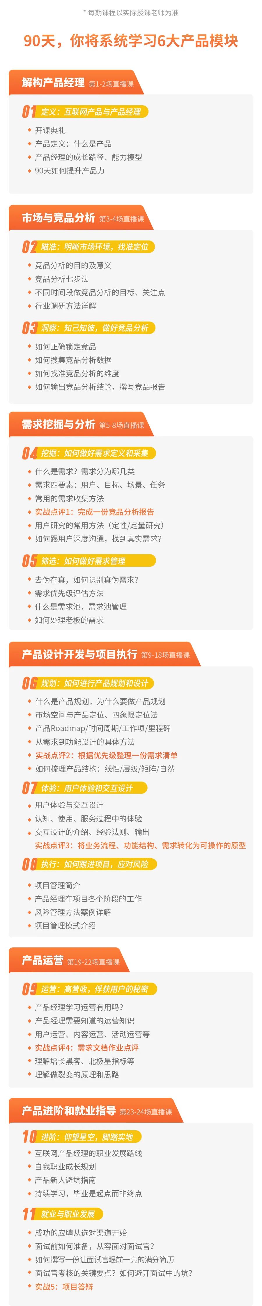 课程以6个产品知识核心作为主体,它们分别是:解构产品经理、行业与竞品分析、需求挖掘与分析、设计开发与项目执行、产品运营、产品进阶与就业指导。