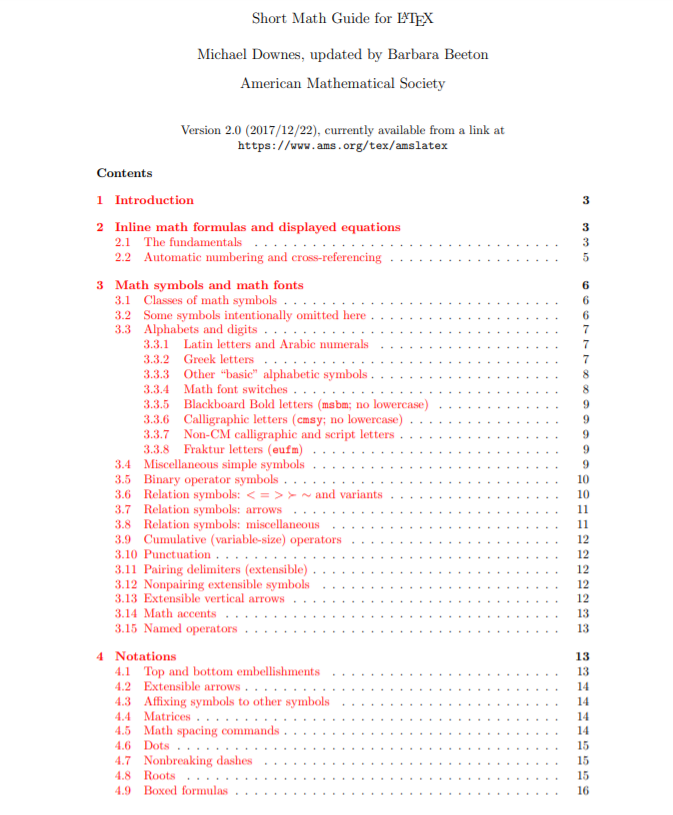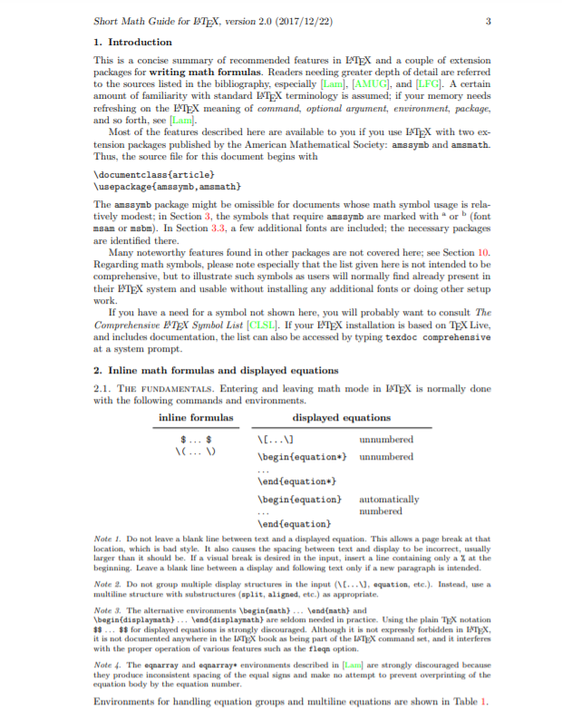 本文简要介绍了LATEX中推荐的特性,以及几个用于编写数学公式的扩展包。需要更深入的细节的读者可参考参考书目中列出的来源,特别是[Lam], [AMUG]和[LFG]。假设您一定程度上熟悉标准LATEX术语;如果您的内存需要刷新命令的LATEX含义,可选参数,环境,包,等等,参见[Lam]。如果您将LATEX与美国数学学会发布的两个扩展包(amssymb和amsmath)一起使用,那么这里描述的大多数特性都是可用的。因此,这个文档的源文件以\documentclass{article} \usepackage{amssymb,amsmath}开头。在第3节中,需要amssymb的符号被标记为a或b(字体为msam或msbm)。在第3.3节中,包含了一些额外的字体;必要的包在那里被标识出来。在其他包中发现的许多值得注意的特性在这里没有涉及;参见10。关于数学符号,请特别注意,这里给出的列表并不是全面的,而是为了说明用户通常会在LATEX系统中发现的一些符号,这些符号无需安装任何额外的字体或做其他设置工作就可以使用。如果你需要一个没有在这里显示的符号,你可能会想要咨询综合LATEX符号列表[CLSL]。如果您的LATEX安装是基于TEX Live的,并且包含文档,那么也可以通过在系统提示符下输入texdoc comprehensive来访问该列表。