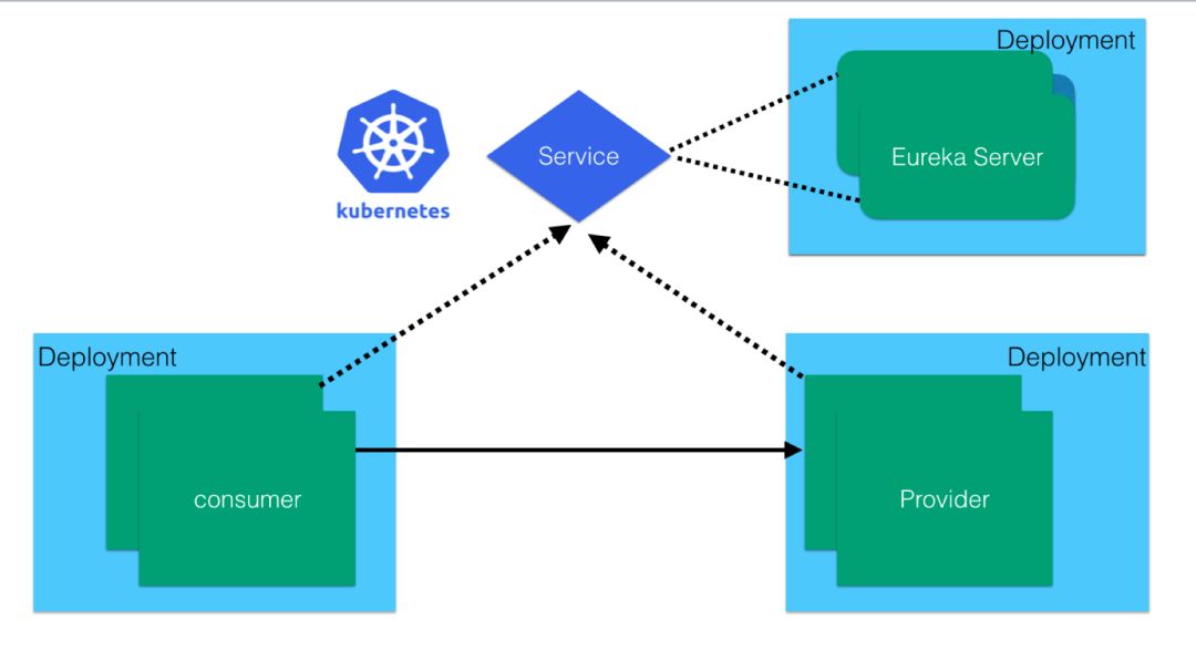 使用三个Deployment分别部署Eurake Server, consumer和provider。创建一个”ClusterIP”类型的Service为Eurake Server提供服务。示意图如下: