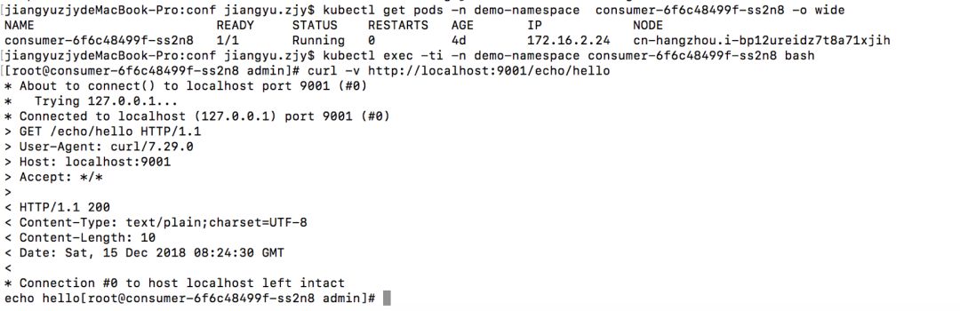 通过在 consumer 上执行curl -v http://localhost:9001/echo/hello, 验证服务调用正常。