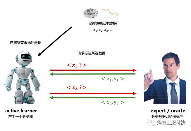 Active Learning来自于一个朴素的想法,假如得到标签的成本很高昂,那就应该去寻找能对当前算法提升最大的样本请求打标,起到事半功倍的效果。该方法假设了一个active learner与专家进行多轮主动的交互,并持续的根据专家标注返回的结果更新分类器。
