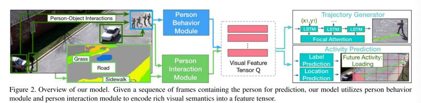 第二篇是CVPR 2019卡耐基梅隆大学&谷歌&斯坦福大学的工作,他们的工作同样使用LSTM来接收历史信息并预测行人的未来轨迹。不同于其他算法的地方在于,这个模型不仅接收待预测行人的历史位置信息,同时也提取行人外观、人体骨架、周围场景布局以及周围行人位置关系,通过增加输入信息提升预测性能。除了预测具体的轨迹,算法还会做粗粒度预测(决策预测),输出行人未来时刻可能所在的区域。