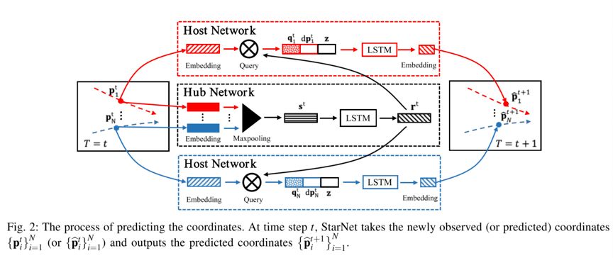 我们的算法结构如上图5所示,Host Network是基于LSTM的轨迹预测网络;Hub Network是基于LSTM的全局时序交互计算网络。在论文具体的实现中,首先Hub Network的静态地图模块是通过接受所有障碍物同一时刻的位置信息、全连接网络和最大池化操作得到一个定长的特征向量;然后动态地图模块使用LSTM网络对上述的特征向量进行时序编码,最终得到一个全局交互向量。Host Network首先根据行人(假设要预测第一个行人下时刻的位置)的位置去动态地图中查询自己当前位置区域内的交互