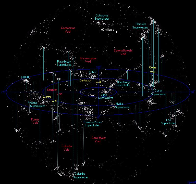 地球附近的大尺度宇宙结构。我们对宇宙的认识还在深入过程中。目前看,宇宙似乎存在宏观结构,星系或是星系团依附在类似蛛网状的结构之上,分布其中(来源:NASA)