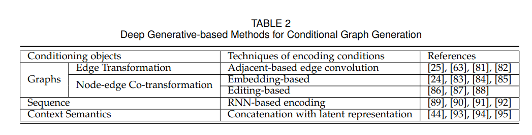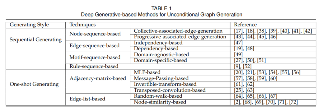无条件深度图生成的目的是通过深度生成模型从真实分布p(G)中抽样的一组观察到的真实图来学习分布pmodel(G)。根据生成过程的风格,我们可以将这些方法分为两个主要分支:(1)顺序生成:按顺序依次生成节点和边;(2)一次生成:根据矩阵表示建立一个概率图模型,一次生成所有节点和边。这两种生成图的方法各有优缺点。顺序生成虽然高效地执行了前一种生成的局部决策,但在保持长期依赖性方面存在困难。因此,图的一些全局属性(如无标度属性)很难包含进去。此外,现有的关于序列生成的工作仅限于预先定义的序列的顺序,从而留下了排列的作用。一次性生成方法可以通过多次迭代同步生成和细化整个图(即节点和边),从而对图的全局属性进行建模,但由于需要对节点之间的全局关系进行集体建模,其时间复杂度通常超过O(N2),因此大多数方法难以扩展到大型图。