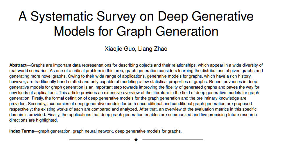 图是描述对象及其关系的重要数据表示形式,它们出现在各种各样的现实场景中。图生成是该领域的关键问题之一,它考虑的是学习给定图的分布,生成更多新的图。然而,由于其广泛的应用,具有丰富历史的图的生成模型传统上是手工制作的,并且只能对图的一些统计属性建模。