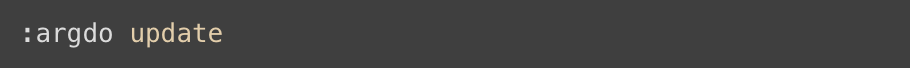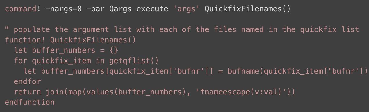如果我们知道被操作的文件需要在哪里运行替换命令,那么上一个技巧可以正常工作。但是大多数时候,我们需要搜索文件中的文本,然后只在这些文件中运行替换命令。此时,我们可以通过使用 vimgrep 命令在文件查找匹配。vimgrep 命令可创建快速列表,其中包含与模式匹配的文件,该列表可通过 :copen 命令来打开查看。如果我们希望快速列表有用,需要使用 vimrc 文件中的 :Qargs 映射来将其转换为参数列表: