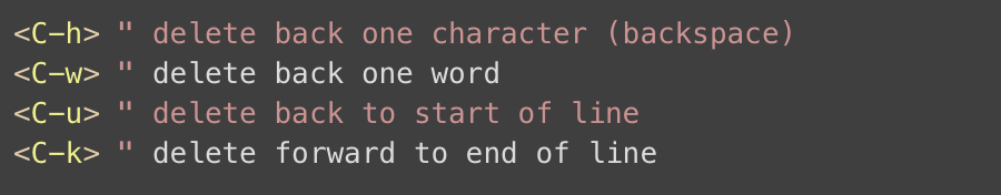 如果需要在插入模式、Vim 命令行模式或 Shell 命令行中删除字符、单词或行,有以下的快捷方式:
