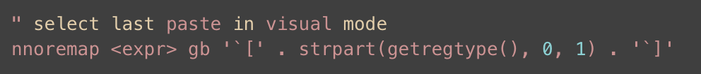 我们可以使用 gv 来选择原始的需要复制的文本,使用 gb 选择上一次粘贴的文本。gb 是一个自定义的映射,可将其添加到 vimrc 文件,而且该命令在进行提取方法重构、剪切时十分有用。我们还需要修复缩进,使用 gb 可以轻易选择粘贴的文本,然后使用 < 或 > 来进行修复。