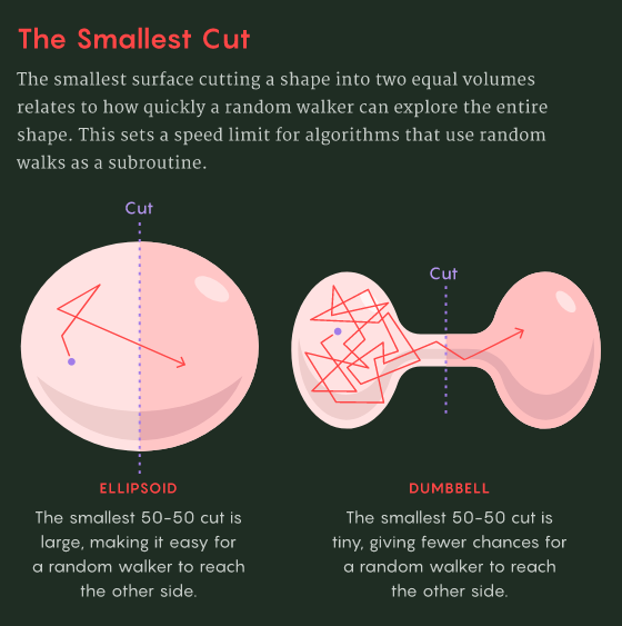 但研究者们渴望改善这一结果。他们知道 KLS 因子包含了凸形内随机行为的信息,因为最佳切割越小,随机过程就越难在凸形的周围快速扩散。