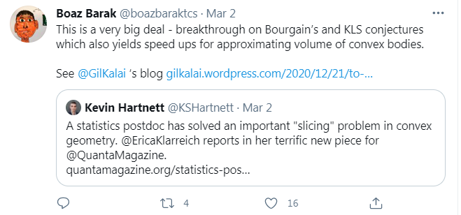 哈佛大学计算机科学教授、微软研究院前新英格兰首席研究员 Boaz Barak 发推祝贺。并表示这是一个非常重要的突破,加速了对近似凸体体积的研究。